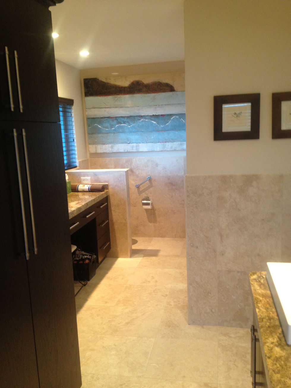 This project showcases modern kitchen and bathroom designs with sleek cabinetry, unique lighting, and stylish fixtures. The images highlight the use of stone tiles, freestanding tubs, and contemporary interior design.